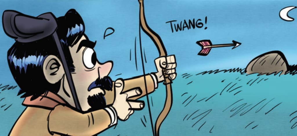 (Softly) Show yourself. (He walks slowly upstage. He sees something in the distance. It is too dark to make out what the figure is.) There you are. (He takes a deep breath, hold it for a few seconds and as he exhales he shoots the arrow. It pierces the figure in the distance.) Got him!