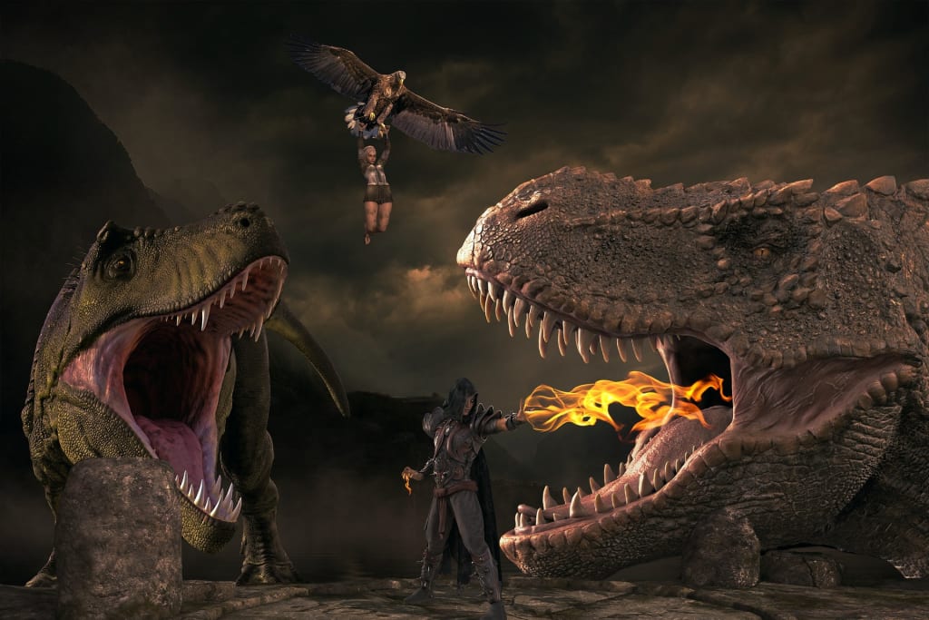 “Then it’s time we were getting out of here!” Dylan hollered back. Bret leapt up behind him onto his steed and together they rampaged for the exit, closely followed by their mounted comrades who joined them in shunting aside or flame-jetting any straggling tribesmen who tried to block their route. The remaining bars of the gate gave way in short order, and with Steam blazing through the upper reaches abreast of them the three great lizards and their riders hit the trail, until the sounds of riot and turmoil were far behind them in the distance.