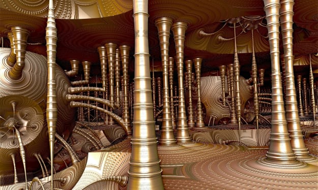 When The Four Heroes had last been in this place, they had witnessed a proud, cruel and magnificent empire that The One Below ruled as sole warlord. It was unlike human civilization in many ways, based as it was around the strange silicate-based lifeforms of this underground land, but nevertheless all the trappings of culture, of academia and of technology had been apparent and recognizable. Everything of that was gone now. Before the eyes of our heroes as they gazed through the portholes sprawled an alien vista, a twisted terrain suffused with eerie light that seemed to shimmer from the rocks themselves. The stalagmites and stalactites were not shaped as they should have been, but were warped and pointing in crazy directions as if gravity itself were pulling them into unnatural attitudes. This discoloured and deformed geology rambled far away in every direction until the blackness of the depths swallowed it up, and there was no trace at all of any surviving cities or the millions of stony beings that had once populated them.