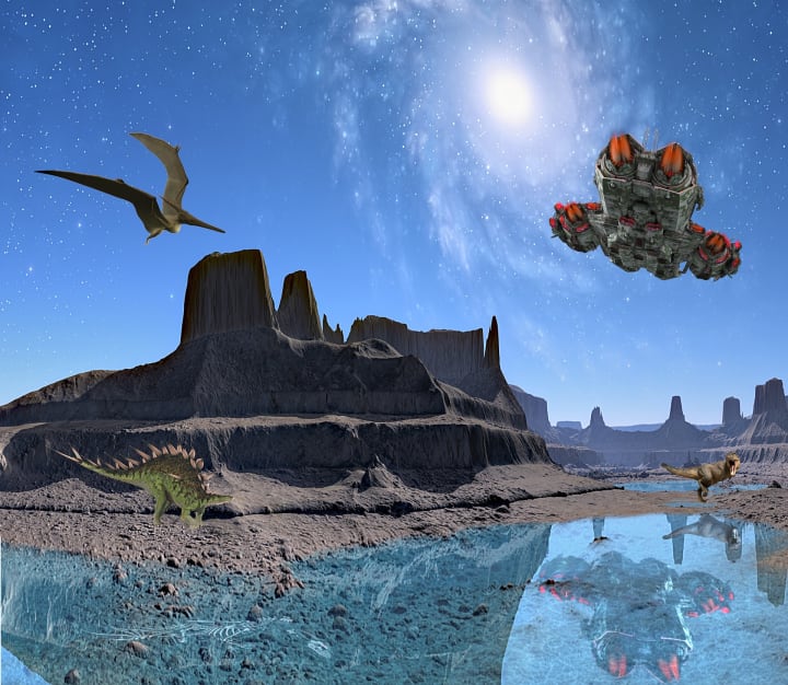 “They’ve hit the secondary fuel tank!” Dylan yelled, frantically throwing switches all across his many control panels. “Get them off our back while I try to hold her steady!”