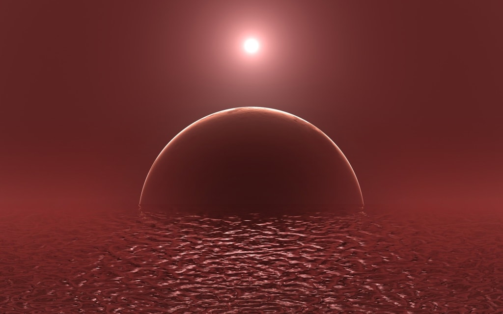 The Chancellor stood. Their land appeared to be a vast circular valley rolling as far as the eye could see in every direction, ringed on its farthest horizons by sheer peaks, and he and his companions were at the very centre. Scattered groups of the diminutive folk were visible in the distance, where they appeared to be scraping the sparse lichen from the rocky walls, while everywhere around played the weird purplish glow that had been the first thing The Chancellor noticed. It did not take him long to locate its point of origin. Directly above their heads, hundreds of feet high, a radiant sphere of the unnatural light hung like a bloated subterranean sun. Close at hand was a towering wooden platform, apparently built by the tiny marble men, with steps winding all the way up to this ominous orb’s corona.