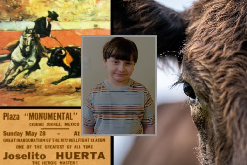 The fanfare blew and I walked out with the guy who would announce me. The crowd cheered politely, not knowing what to make of me. I may have had Mexican blood, but I looked like a slice of American white bread. I didn’t care, though. I was going to make my dad and my country proud. I heard the announcer say something about “niño Americano” and the crowd seemed to collectively go, “oh, that explains it.” Then he said my name, “Miguel Arronte” and I knew my moment of greatness was at hand. I adjusted the toreador hat on my head, held out the cape, and waited for the calf to trot out.