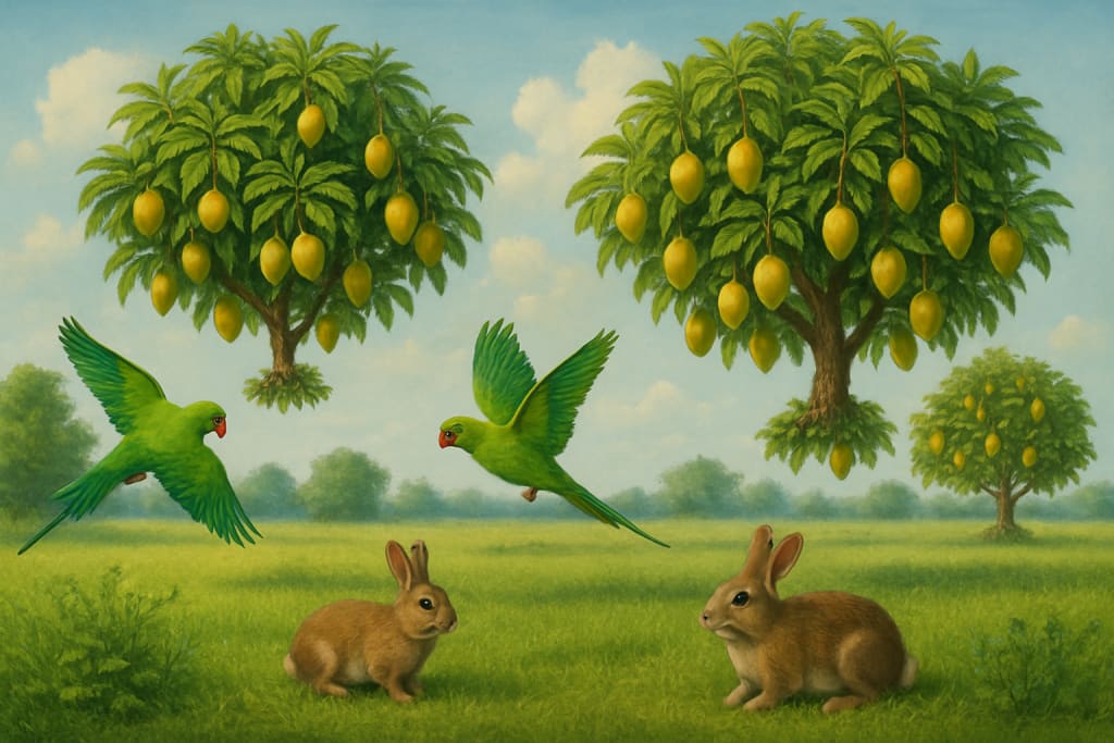In a quiet village nestled between velvet hills and crystal-clear streams, there was a magical mango grove known as Sundarvan. The grove was unlike any other—its trees, rich with golden mangoes, floated several feet above the ground. Their roots dangled gently in the air, as if sipping moisture from the breeze itself. The villagers believed the grove was a gift from the forest gods, guarded by two watchful spirits: a pair of green parrots named Mithu and Meera, and two clever rabbits named Chikki and Chintu.