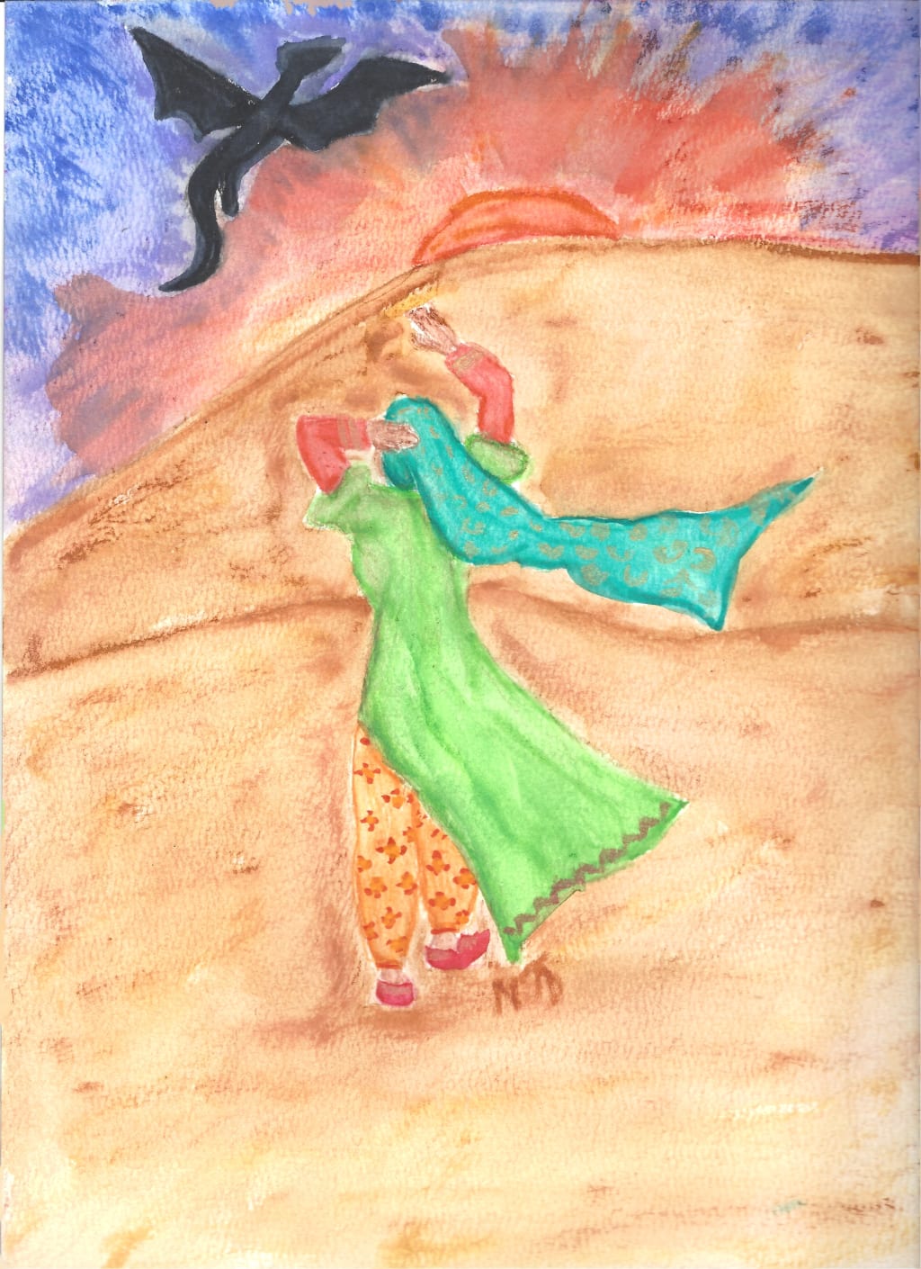 As the sun dipped below the horizon, they stopped at a small oasis to camp for the night. Ari surveyed the rolling dunes as Dayn watered Sorrel at the spring bubbling up from the center.