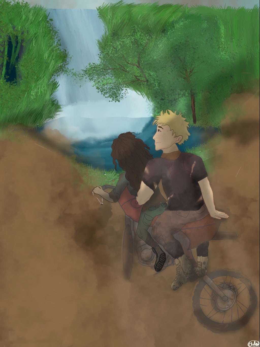 We look around, once the dust clears, and see a green lush valley, overflowing with colorful plant life. The air smells clean and sweet, we hear a noise and rush over to see a waterfall surrounded by a deep pond.