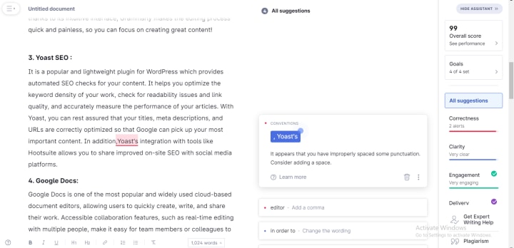 It helps you produce quality content with solid grammar and punctuation by scanning your work for errors, malware, and other potential issues.