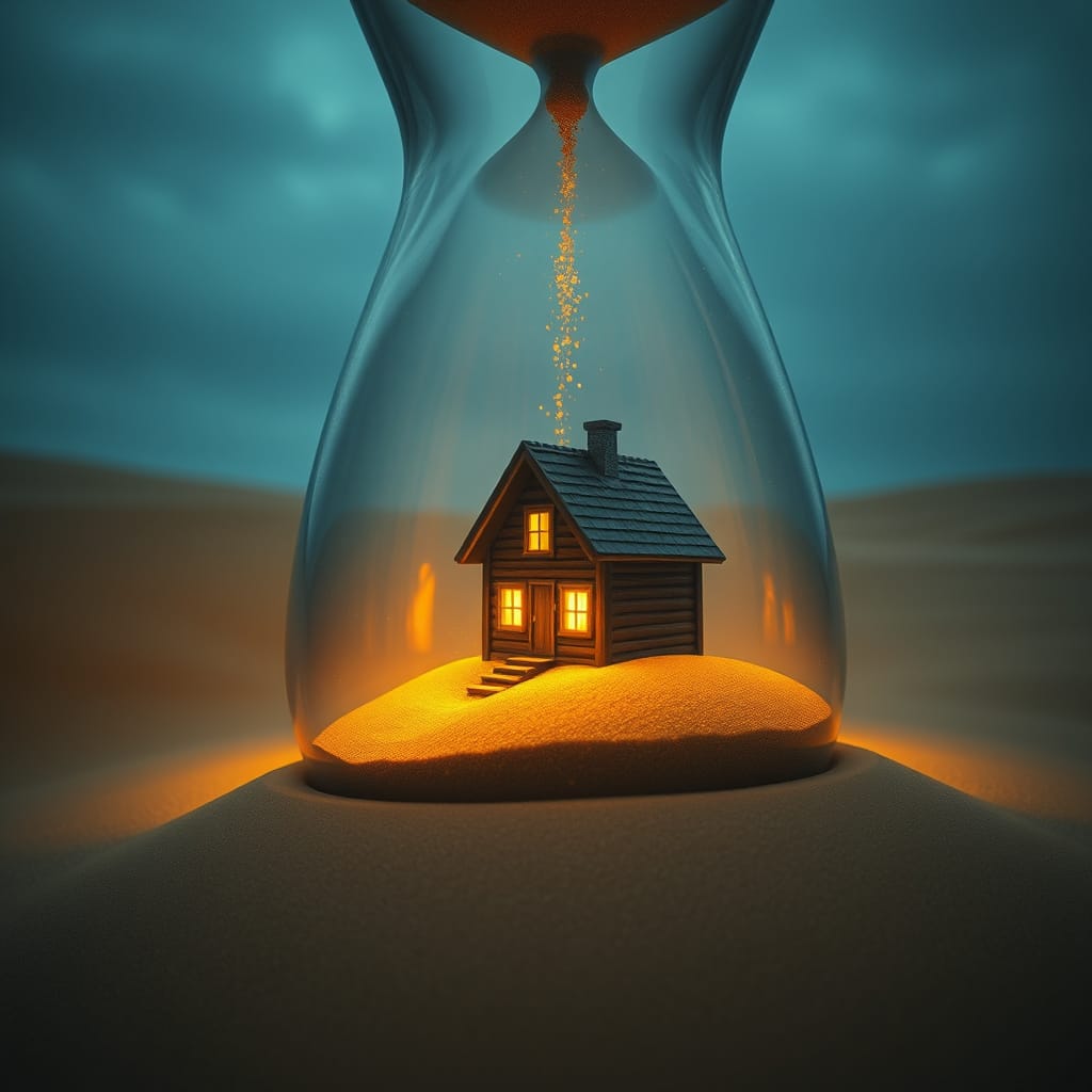 Til then he watched the grains of sand hit the bottom of the hourglass like dry rain. It was unusual, in that there was a small house in either side of the hourglass as one was revealed the other was buried. He couldn't count the grains of sand, and once they were all in the bottom half, burying the cottage, he would decide what to do.