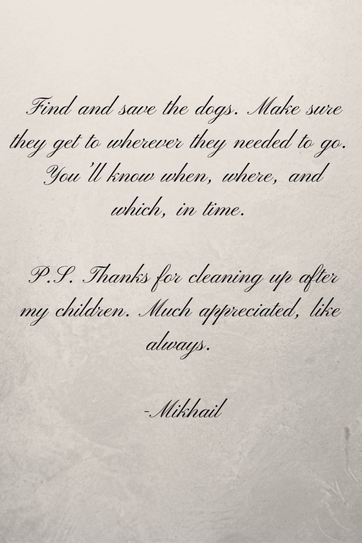 “Find and save the dogs.” Eliza shredded the paper and grabbed the silver dagger that was hidden in a secret compartment underneath her dark mahogany desk. “You’ll know when, where, and which in time. Real specific, Mikhail. Would it kill you to describe what the dogs look like?”