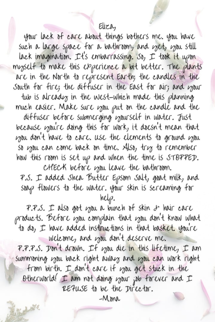 The usual bare, white-tiled bathroom was immaculately decorated with plants, candles, an essential oil diffuser, and other bathroom stock items that Eliza never thought of buying herself. The tub was already filled with hot water, and different colored soap flowers floated on top. Before she called Mona to ask, she noticed a note on top of the folded clothes that sat on the chair. She read it with a smile on her face.