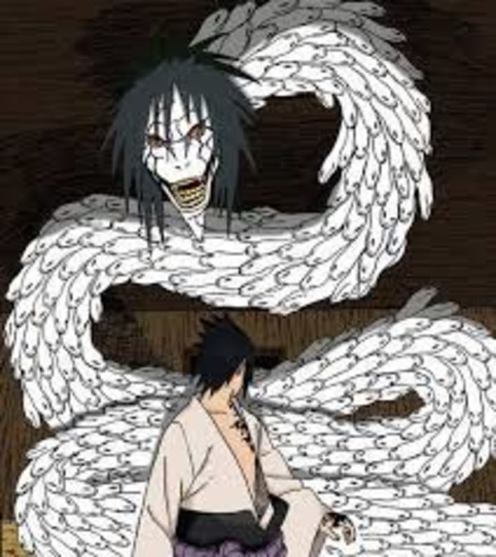 Mitsuki is an artificial life form created by Orochimaru and is my personal favourite member of the new team 7. I have only watched the anime and therefore do not know whose DNA Orochimaru used other than his own to create Mitsuki. However, given the fact that Mitsuki achieved "White Snake Sage" means that his other parent must have been very strong physically or had a lot of chakra. This is because Orochimaru himself tried and failed to become this sage due to him not being strong enough and as a result he became a giant snake as shown below.