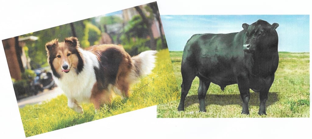 “One of the things he bought was this bull.” She covered the picture lying face down on the table with her hand. “He came from a top quality breeding line and cost us a lot of money. Grandpa’s plan was to use him to produce a line of championship cattle as well as rent him out to service our neighbour’s herds, as a way to make extra money. It was a good plan, had it worked out, but this bull had a mean streak in him that no one told us about. One day, Virgil was out in the corral and the bull turned on him. It charged and rammed him into the corral posts so hard that it cracked his ribs. He backed off to charge again, when Lassie took over. She was a Sheltie, you know. They have been bred especially for herding animals: cattle, sheep, goats, whatever. And believe me, she was good at it. Always herding anything that moved. She charged into that corral, right into that bull’s face, grabbed his nose with her teeth and hung on, giving Grandpa the time he needed to scramble over the fence. However, the bull managed to shake her free. He trampled her to death with his sharp hooves.“