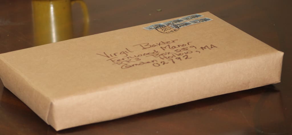 It was on one of these breaks that I found the parcel wrapped in brown paper. I was strolling past the bookshelves, not really paying much attention, when I noticed that a few of books didn’t appear to be pushed to the back of the shelf. I pushed on them. They didn’t move. It was like there was something behind them. I pulled out a couple of them, and yes, there was something there. I took out a stack of them and revealed the rectangular parcel about two inches deep, wrapped in brown paper. I pulled it out and looked at it. On one side was my grandfather’s name and address. There were hand canceled stamps in the right-hand corner, so it obviously had come through the mail at some point. It didn’t look like it had ever been opened. I set it down and replaced all the books I had moved to their place on the shelf, pushing them right to the back like they should be. Then I picked up the parcel and took it back to my chair to examine it more closely. The longer I looked the more I became convinced that it had never been opened.