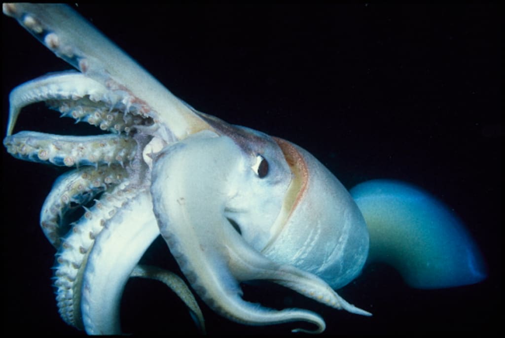 They live in shoals which can be as large as 1,200 individuals and can move incredibly fast, upwards of 15mph, propelled by water ejected through a hyponome (siphon) and by two triangular fins. The ejected water generates enough force to send them them flying out of the seas to heights as far as 10 feet or more above the surface. It is this ability to "fly" that has been the source of many myths and legends among the men who fish for them. The legends speak of colleagues or friends "dragged down to the briny depths" by hunting Humboldts flying out of the water and snatching a man who was too close to the edge or not paying enough attention to his surroundings and situation. In some cases it is said the men were first hypnotized by the flashing lights of the squid, putting them into a trance like state and immobilizing them, making them easy pickings for the squid. It is their color generating (chromogenic) behavior that has been the source of most of the legends specific to the Humboldt squid. Those legends tell of men not dragged down to the briny depths against their will by squid flying out of the water to snatch the unprepared or unaware or tranced, but rather men who willingly (of a sort) give themselves to the squid, walking or running or jumping from the sides of the boats they are in directly into the maws of the waiting, hungry squid. It is said these men were compelled to their deaths by one or more Humboldts who used their flashing lights to "hypnotize" and "trance" them and force them to feed themselves to the squid.
