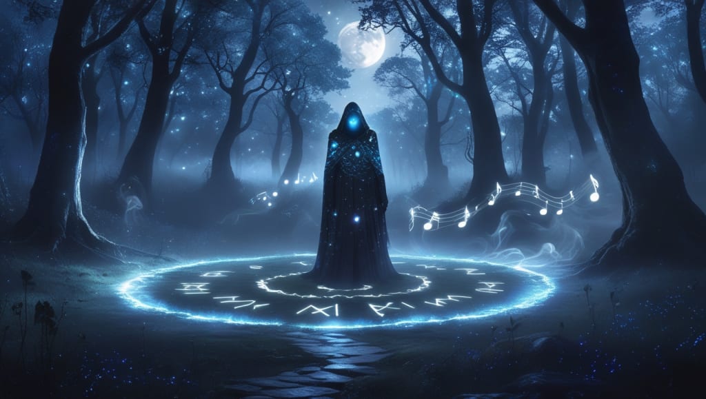 They wore a cloak woven from shadows and stars, their face hidden beneath a hood. The melody seemed to rise from them, wrapping around my skin like a warm breeze.