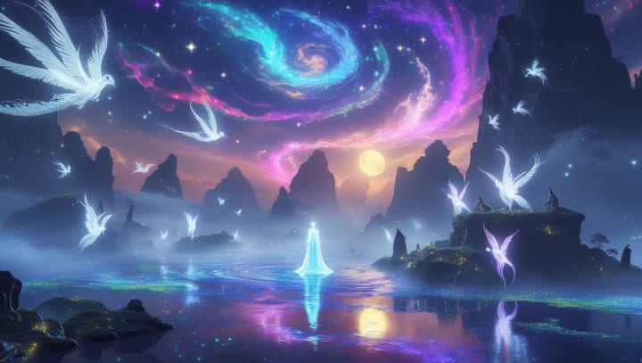 The sky above was a swirling tapestry of stars and mist. Strange creatures moved through the air—winged beasts with feathers that gleamed like silver, and shadows that flickered at the edges of vision.