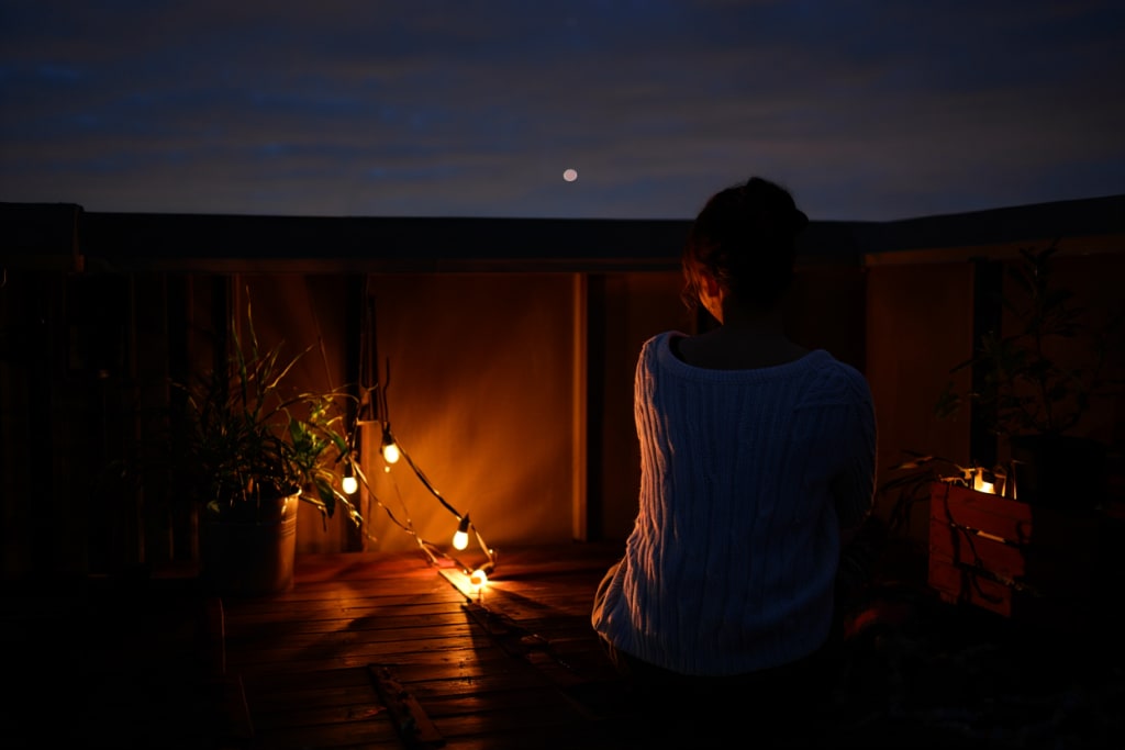 A lone person sits on a rooftop at dusk, wrapped in a soft, oversized sweater. Their back is to the viewer. Around them: a quiet, calm sky—deep indigo with faint stars just beginning to appear behind wispy clouds. A half-burnt candle flickers gently beside them. In their lap rests an old, closed book (The Little Prince, subtly visible). Everything around is still — peaceful, reflective, full of unsaid emotion.