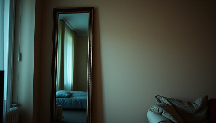 I get home, toss my bag down, flick the lights on—and BAM. There it is. The mirror. Dead centre on my living room wall, like someone hung it up just to mess with me. Same busted frame. Same spiderweb crack in the corner. Only problem? I live ten stories up, and I never took that thing with me. Never even told a soul about it.