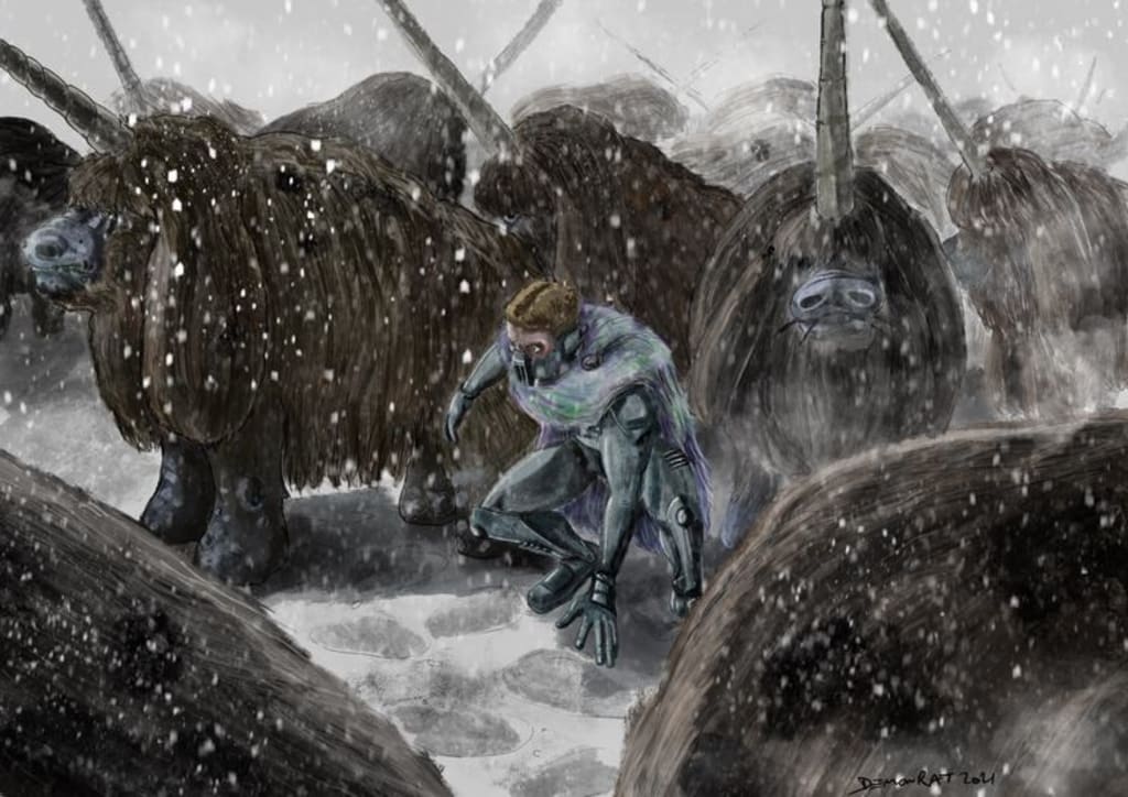 “The Dravar Sail…,” Oso contemplated aloud with Avtar, “....hmm, it’s an amazing piece of equipment from the description Mother Victoria provided,” Oso thought to himself as he began to emerge from the frost covered forest. He had only been this far away from the compound a few times in his life. The C creature he had studied his entire life did not venture far from the forest areas of the icy planet.
