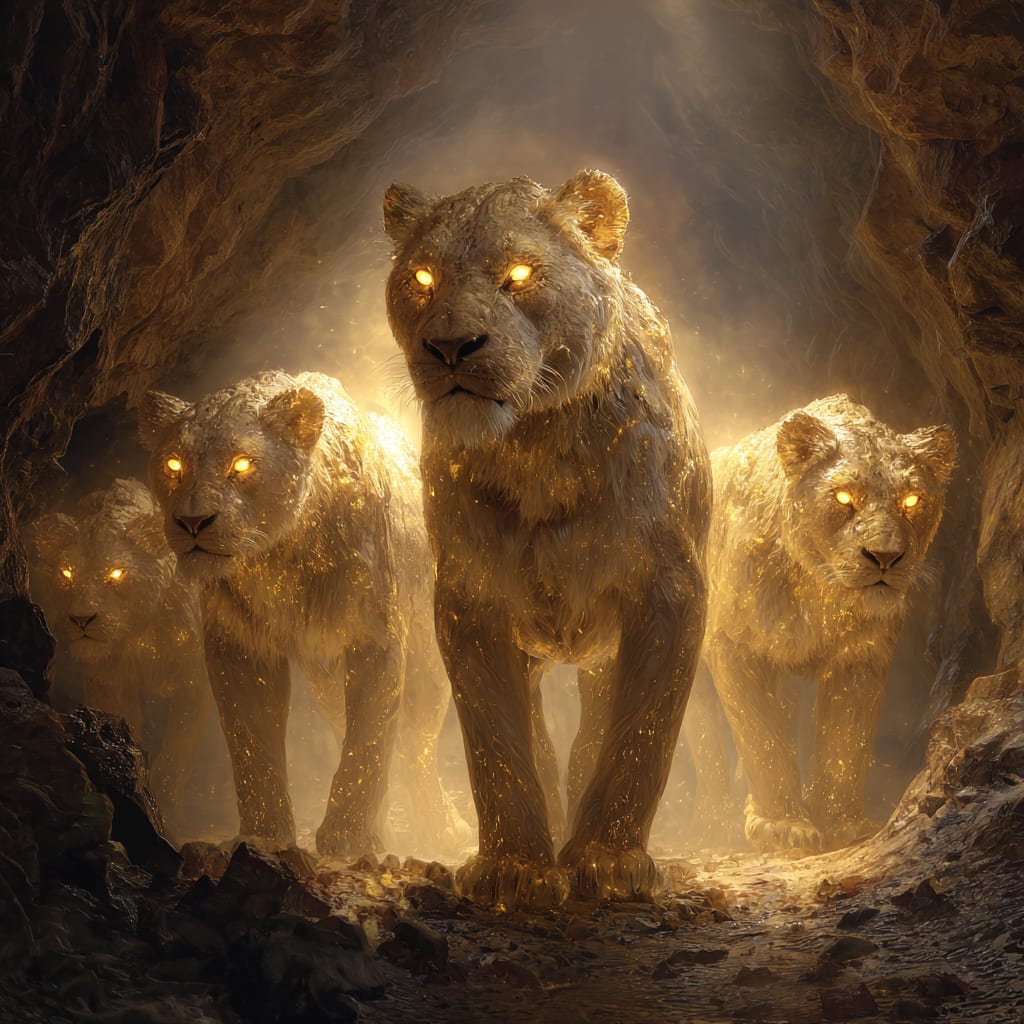 Four lions moved as one, their manes shimmering like molten sunlight even in the dim glow. Their commentary was a chorus of pride, defiance, and sharp observation, weaving through the clash of battle as they advanced.