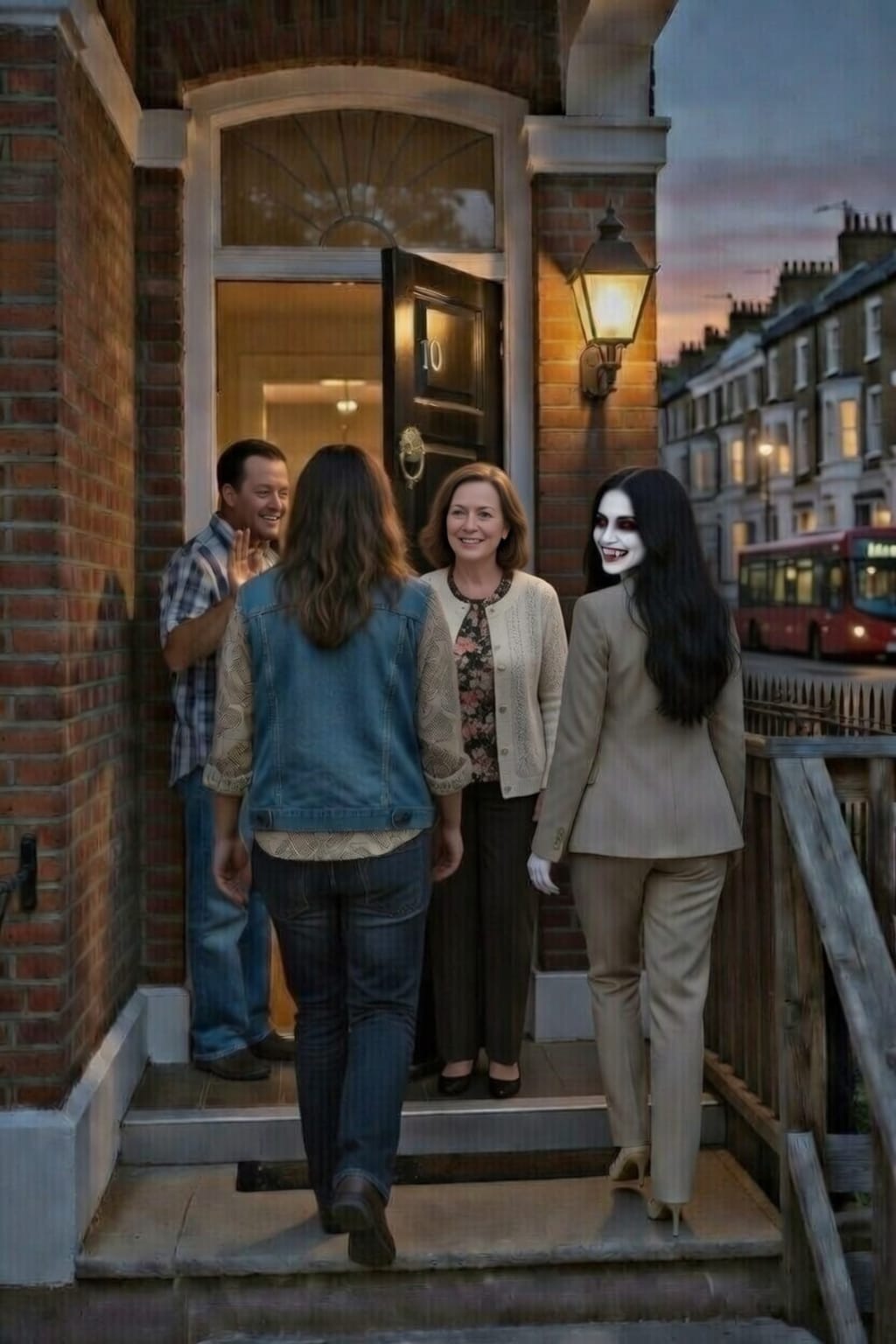 ‘Hello!’ Janice had a beaming smile plastered over her face as she pulled open the front door. She kept the smile fixed in place despite the sight of Jack’s date. Although she was dressed conventionally enough in a beige trouser suit, it was obvious from her chalk-white skin, black eyes and the two fangs resting menacingly on her bottom lip that she was a vampire.