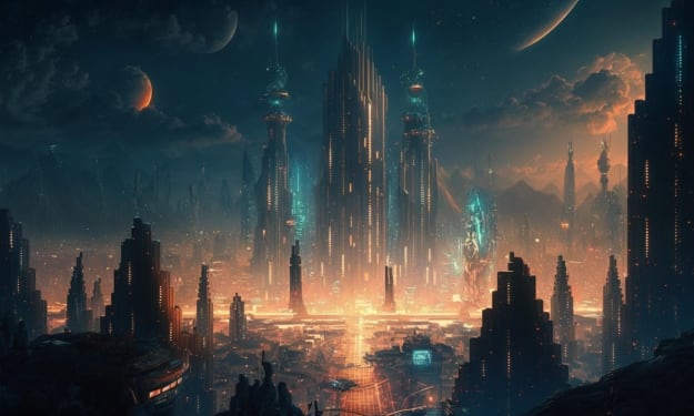 The Vend's headquarters was the second largest Ziggurat in downtown Benglese. It was packed deeply into the architecture of the city. Kevin gazed upwards, but he couldn't see the top of it. The furthest he could see was it's middle, which penetrated through thick, luminous nighttime clouds. The clouds were all glowing with a neon reflection, against the light of Avax's single, giant moon.