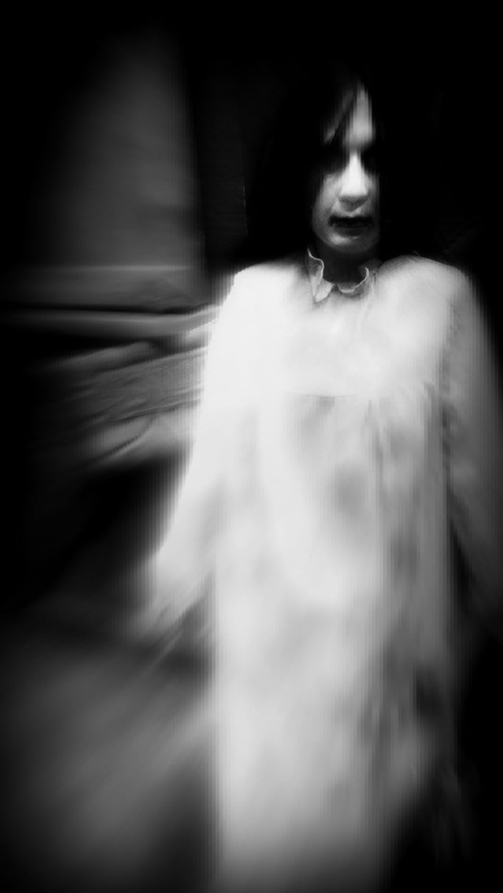 Sometime late in the night, he was awakened by tapping coming from the kitchen window. He grasped the golf club tightly and eased his way toward the sound. By the light of the full moon, he was startled to see the living dead corpse of a middle-aged woman peering intently through the window, wearing a simple white dress. A glob of bloody phlegm dripped from her chin and onto the windowsill. He was terrified, thinking she could see him and would break through the glass with a few of her ghastly brethren. He relaxed slightly when he realized she could not see him in the darkness of the unlit room.
