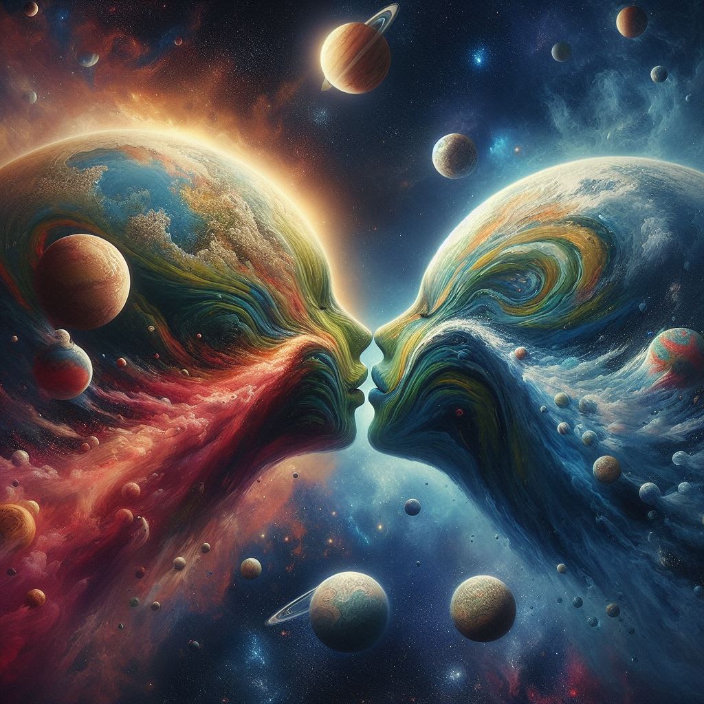 This is the greatest love story in the universe. They are two gigantic spheres trying to get closer to each other, in infinity, under the stars. But the distance between them is very far and their gravitational forces are very weak. Therefore, they can only see each other, cannot touch, talk, or kiss each other.