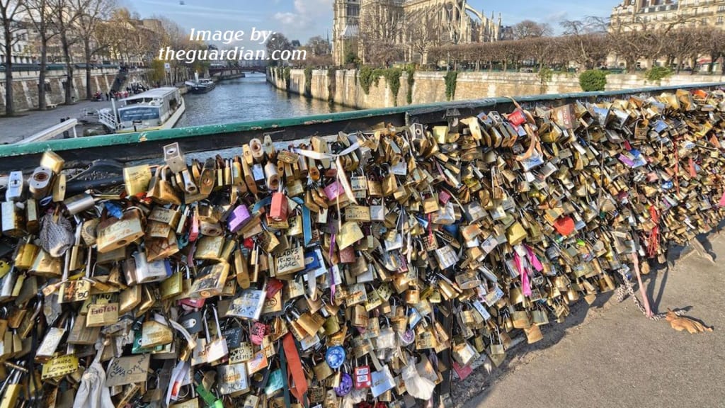 The idea is simple: a couple writes their names on a padlock, then places this lock on a chain link fence (normally located on a bridge over water).