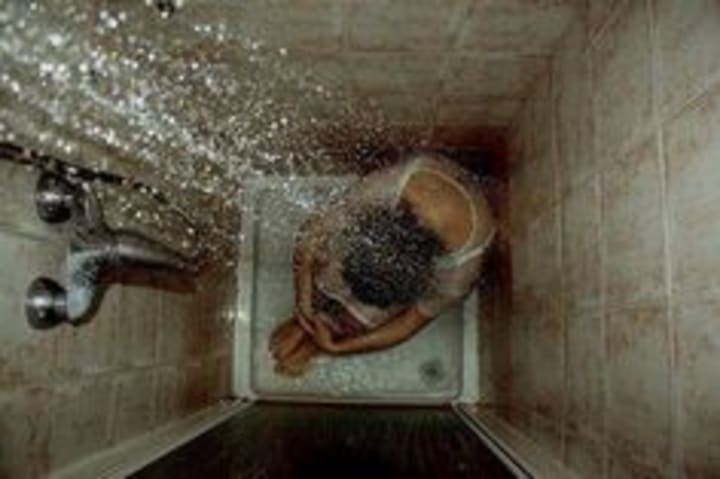 She strips down and gets in the shower. The water is too hot. Instead of adjusting the knob, she tucks her knees under her and crouches on the floor of the tub where it stings less. Downstairs, her husband comes home; she can hear the front door open and close, his heavy tread on the hardwood.