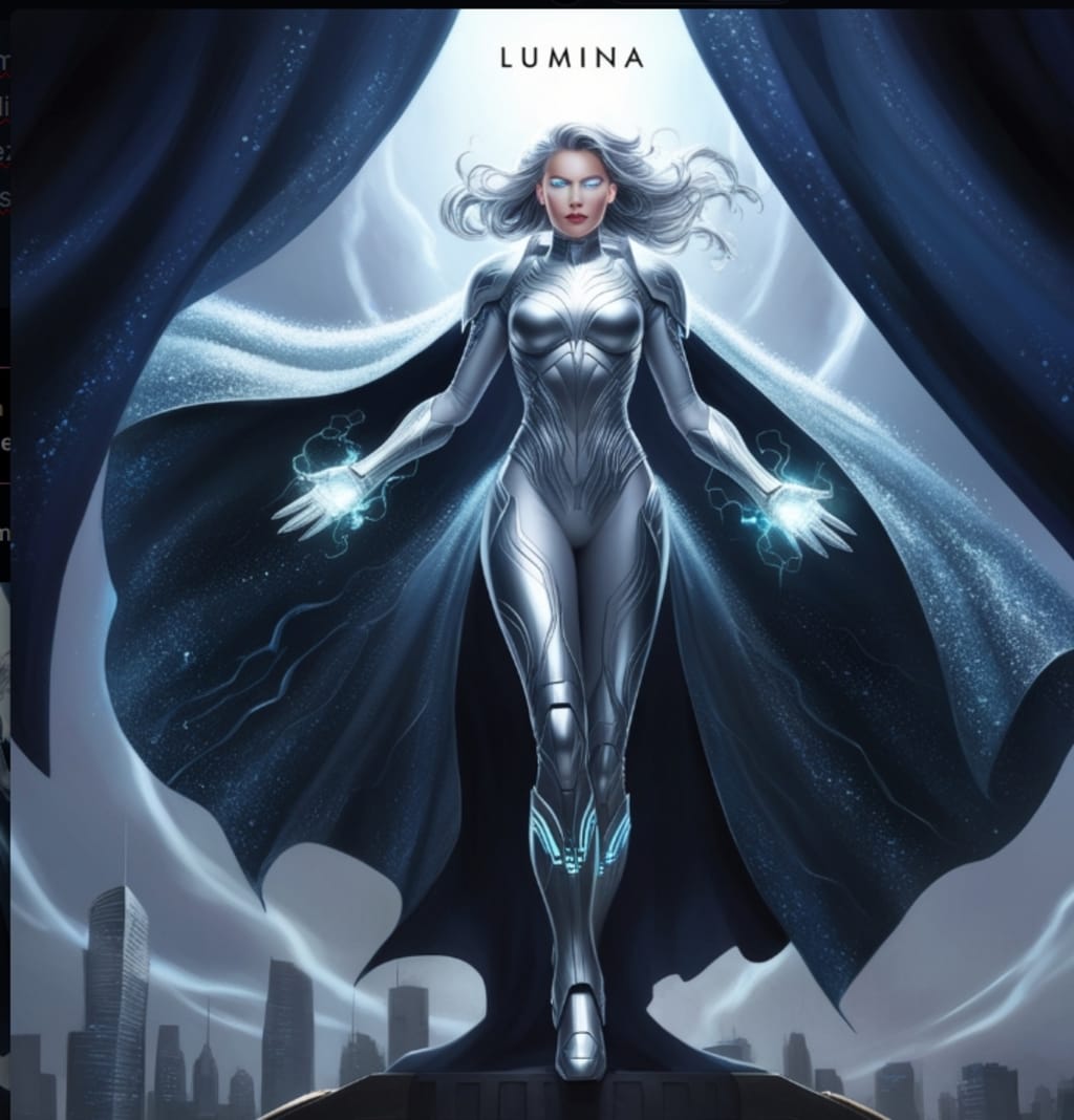 The explosion left Evelyn in ruins, but not defeated. Through the smoke and chaos, she emerged transformed. Her once-muted lab coat was now a sleek, silver armor, and her eyes glowed with a fierce, otherworldly light. With her invention in fragments, Evelyn’s exposure to its energy had infused her with extraordinary powers. She was reborn as Lumina, the guardian of light.
