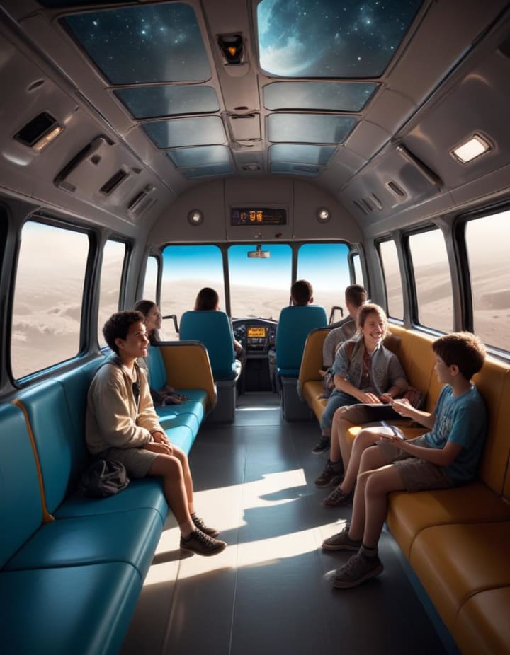 I grabbed my hover backpack and hopped aboard the flying bus that picked us up from our lunar colonies. The bus wasn’t just a mode of transportation—it was an experience. Its metallic frame gleamed against the dark sky, and its anti-gravity wings made it hover effortlessly above the Moon’s surface.