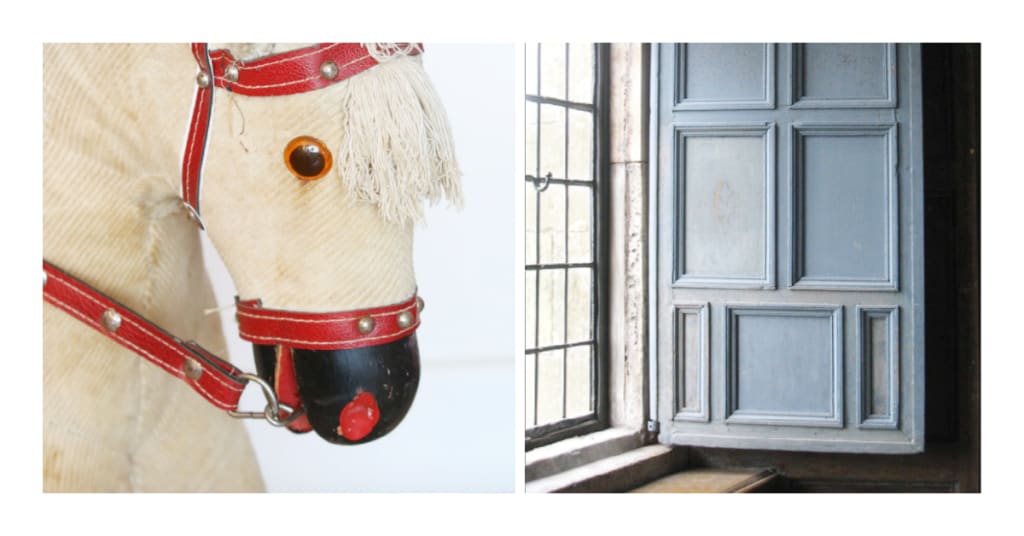 ‘Once again I would sit on the lawn and stare up at her windows. Sometimes I would find that the caretaker at the lodge, who came now and again to air the house had left a blind pulled back, showing a chink of space, so that by pressing my face to the window I could catch a glimpse of a room. There was one room – a dining room, I judged, because of the long side board against the wall – that held my fancy most. Dark panels. A great fireplace and on the walls the family portraits stared into the silence and the dust. Another room, once a library, judging by the books upon the shelves, had become a lumber place, and in the centre of it stood a great dappled rocking horse with scarlet nostrils.’ (from ‘The House of Secrets’, ‘Rebecca Notebook’, Daphne du Maurier)
