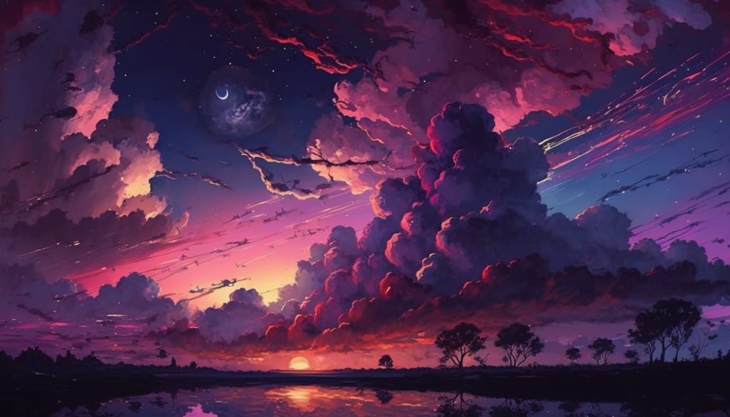 Every night at Midnight, the purple clouds came out to dance with the blushing sky, and everyone who had seen the purple clouds wondered why they danced with the blushing sky consecutively. Most people said it was a bad omen; others said it was a sign that world would end, and some thought it was a sign that they would be happy in the land once again. Most people kept their thoughts to themselves and waited for the day they'll find out the valid reasons why the purple clouds danced with the blushing sky.