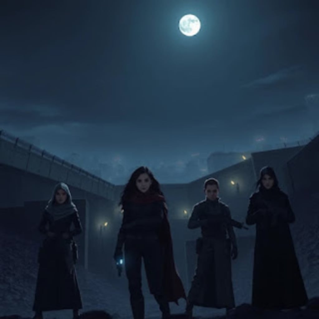After receiving the urgent call about the hostages, Shahinaz immediately gathered her specialized team—Jamal, Alaa, and Nour—at a secure hideout in a secluded alley of the fortified city. Midnight was approaching, and the streets were deserted, but the dim security lights kept the city under constant surveillance.