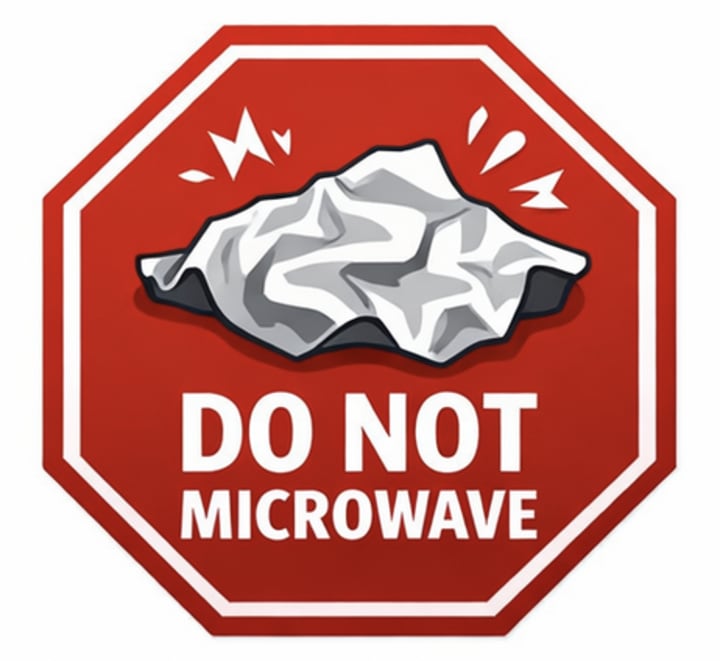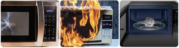 Never put into the microwave anything that contains any metal/foil. This includes metal plates and utensils, sandwich foil wrappers, paper lined with foil, and your grandmother's favorite cup with golden metal edging on its top.