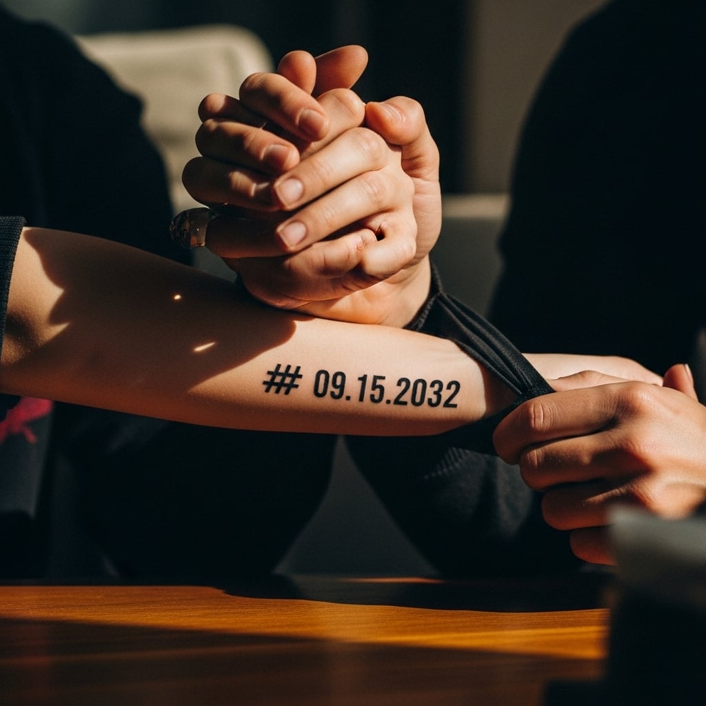 On her forearm, etched in sharp black ink, was a date. Four numbers, simple and unyielding: 09.15.2032.