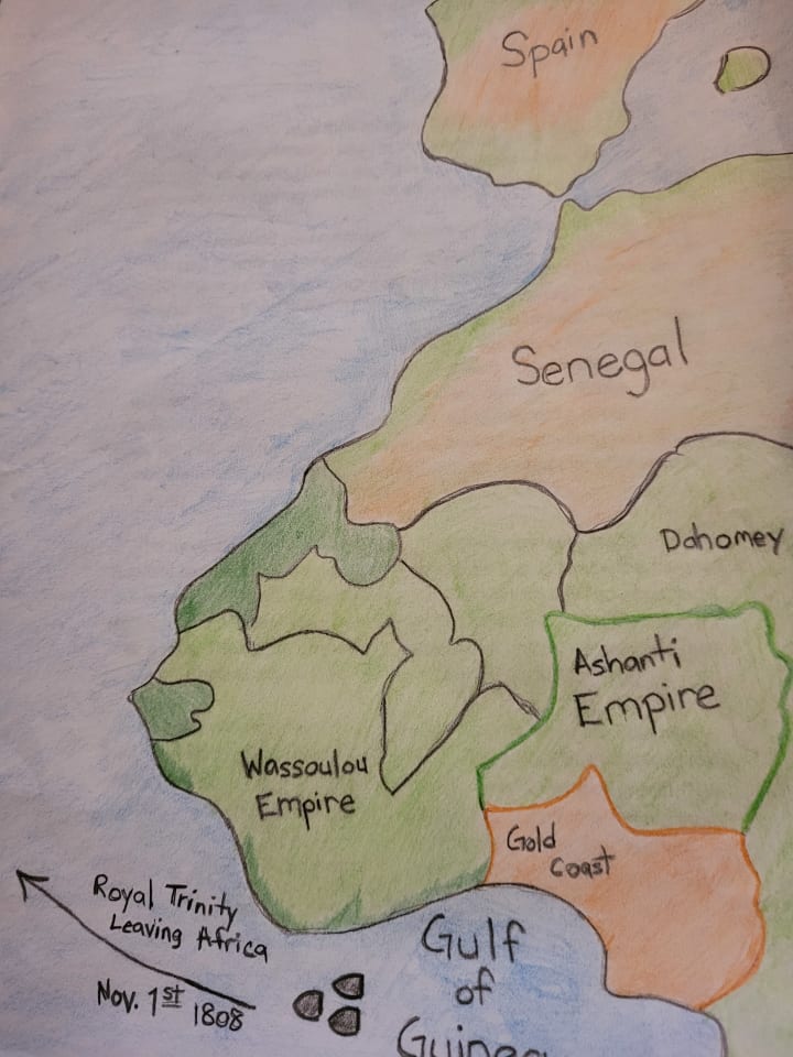 Baptiste knew his small navy could do the job. The three ships that helped begin our great nation were called the Royal Trinity. Jonathan Baptiste captained the Isis. The honorable Captain Salvatori was in charge of the Horus, Captain Cheron led the Osiris. The three ships left the Gold Coast Colony through the Gulf of Guinea on November 1st, 1808.