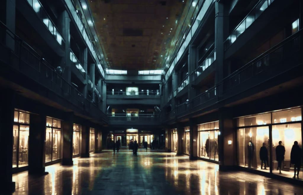 The elevator dings and shudders to a stop. The doors rattle open asthmatically, and I step out onto a dead floor. I look down only three levels and see bright lights and golden glows and moving people, but this floor is quiet, lit dimly with grey. The occasional sepia-saturated accent catches my notice, and despite the grey cast, there does remain some dying vestige of the gold-cream color scheme from the lower levels. The occasional dark figure hurries past, a silhouette in this almost lightless place. I look up. About half the lights are out, and half of those that remain look like they're considering the same path. I turn to my left and follow the walkway around the perimeter of this floor's corpse. Few stores have any light, and what there is recalls some of the golden cheer from below. But no one stands inside the shops for long before hurrying away, as though they sense something is wrong. Only one or two of the lit shops have cashiers, and they look just as dead as the rest of the sixth level. I pass by them, aimlessly looking around. The darkened stores have decrepit steel gates drawn down, like a hat over eyes, across their black doorways. As I wander up the opposite side from the one on which I left the elevator, a store catches my eye. This one is lightless as well, dark inside but for the dim reflected light on the grey walls and the light filtering in from the walkways. It illuminates a dark heathered grey carpet on the floor and the central aisle which proceeds from the main door down to the back wall. In the center, a long, brown, leather couch sits facing the left side of the store. No other chairs give it company, and it simply stands, alone, rather like me. On either side of that central aisle, five-foot-tall display cases stand, hundreds of them, in militantly straight rows, all facing the same direction. They're the kind with the wire baskets aligned on the sides to hold things, the kind that turns slowly if you push it. It's as if this store was set to open, was totally ready and had everything just so, and then choked and died at the last minute. I step inside. Silhouettes of displays loom around me as I go over to the right-hand side of the store, and wander along the wall. They cast shadows on the walls where the faint light of the walkway crawls through the huge, square panes of glass in the windows, just barely giving me light to see by. My eyes are adjusted, and the edges of the displays are lined with the thinnest of lines of light, but still, the store's darkness is strange.