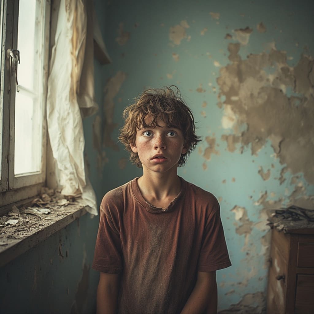 She grabbed at Toby to pull him out of bed, but he just pushed her away. What the heck was going on? Where was he? Why was the room so filthy? Why does this little girl keep calling him Tommy? The smell of cat piss was causing his stomach to turn.
