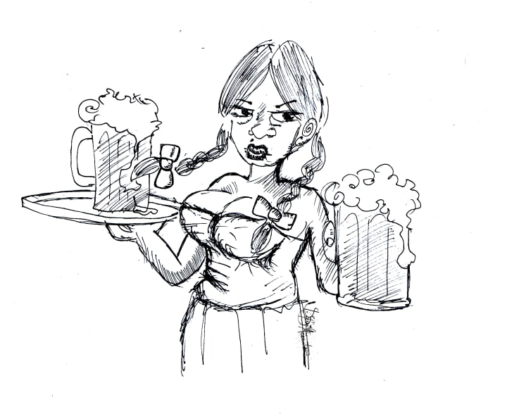 “No, thanks.” Gayle shakes her pigtails and strides past me, giggling with a tray full of beers in tow for the weed smokers playing pool in the back of the bar.