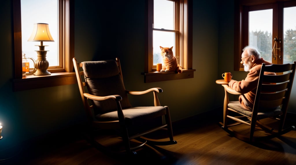The afternoon sunlight pours through the window on the old man and Little Sun, and they freeze the warmth of this moment forever. The old man sat in a rocking chair, and Little Sun lay comfortably on his lap, enjoying this lazy time together.