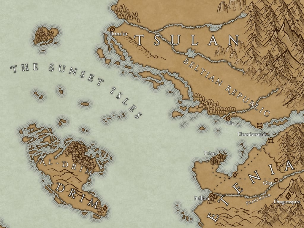 Her nurse having left, Rasai took a deep breath and moved across the luxuriously furnished room, dropping herself into her desk seat with a groan. Sun peered through the large window on the eastern wall of her room, illuminating the stack of books on her desk. Large figures sporadically eclipsed the sun, casting wide, fast-moving shadows along the carpeted floor of the chamber. The late morning supply hauls were a familiar sight—an armada of bound and chained dragons, their sword-like claws covered in thick leather sheaths, hauling cargo from the port of Trien across the Valley and into the inland cities and towns. She watched their massive forms, their scales scintillating in the sun, reflecting light in red and silver flashes across the courtyard of Trien Manor. With a smile, she opened her casement windows and learned gently on its sill.