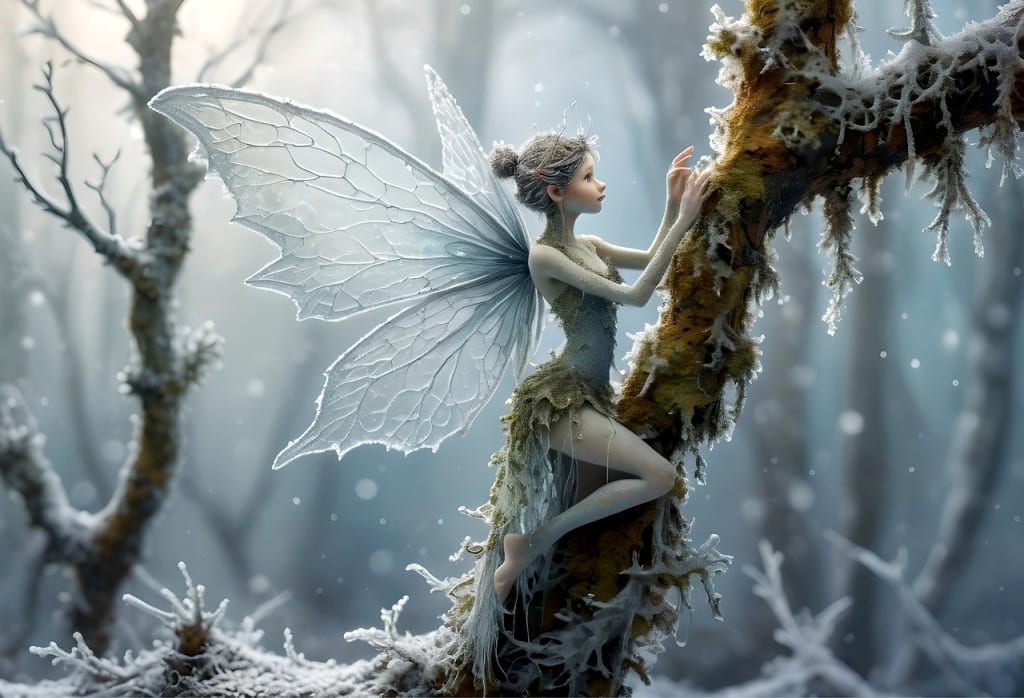 Taken by surprise, I found myself outside, standing on the back porch in my robe and slippers, watching the winged pixie with fascination. Fluttering around, wherever she landed she would leave behind an ice trail. She alighted on the rail before me, and I reached my hand slowly out towards her. Smiling to set her at ease, I motioned for her to land on my hand so that I could get a better look.