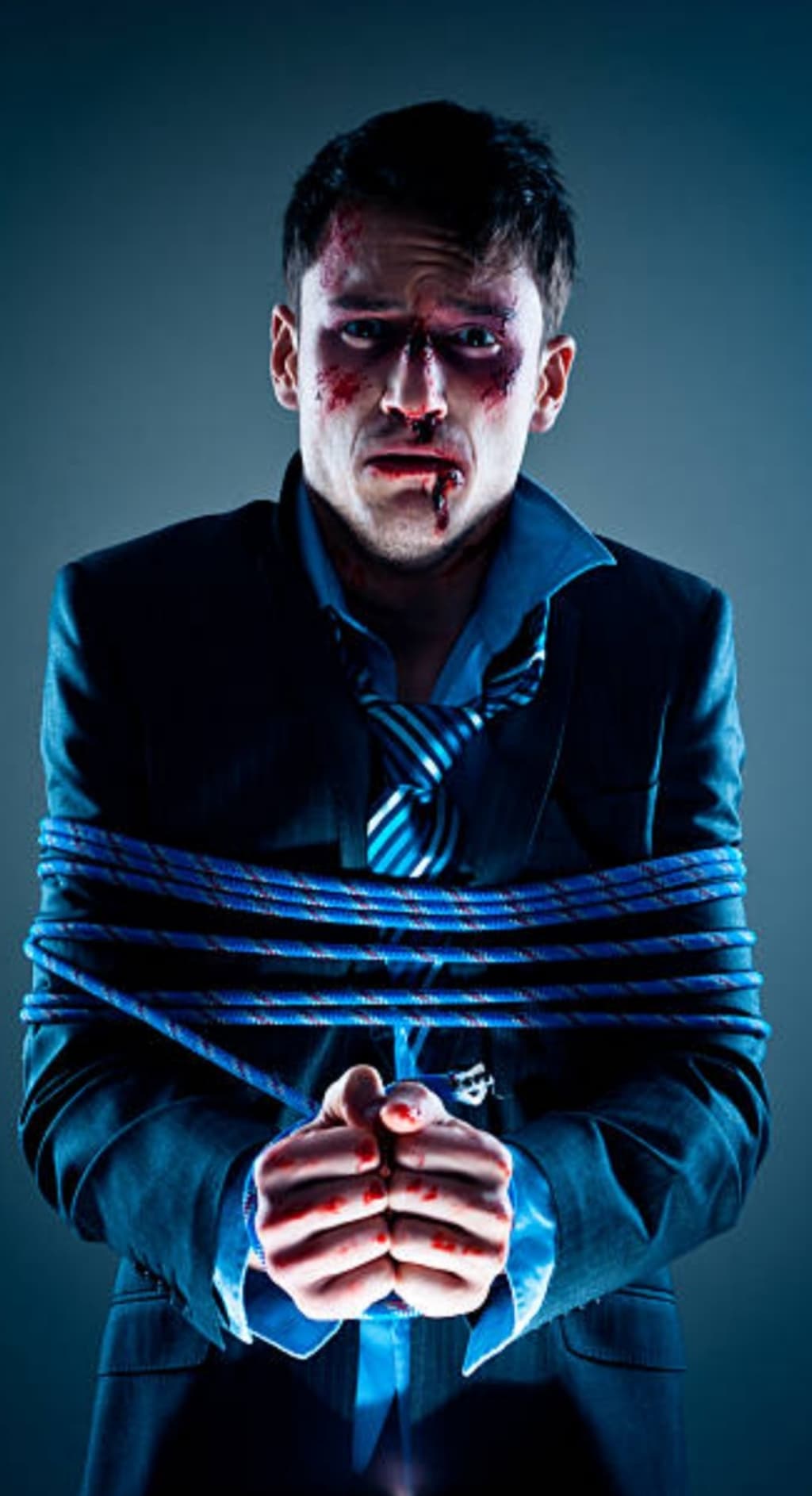 Foregoing caution, I sprint into the room, wielding my hammer in front of me. A stream of light hits Brian, who is tied tightly to a chair. Blood covers the floor and walls, with splatters on the ceiling. His head rests on his chest. Is he alive or dead?