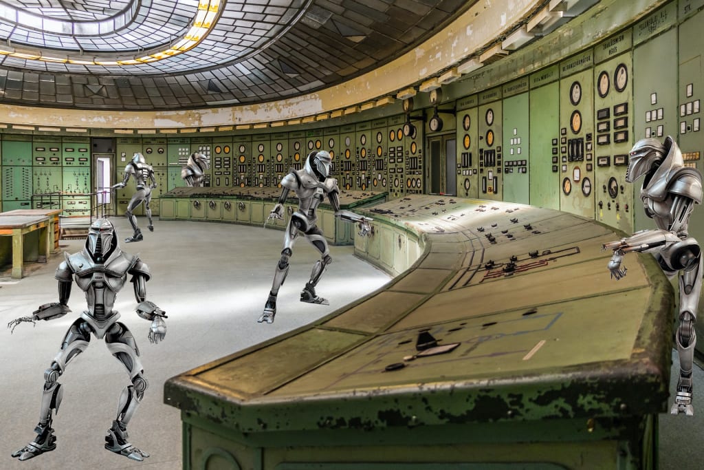 At the core of the Communications Hub sat the monitoring suite, a sphere inside a sphere which being windowless was lit only by colourless holographic images that flickered from flattop projectors and screens throughout its dark concavity. Flights of steps linked the various control-stations and each was manned by a Nemsinod Robig, which were tall robed androids with black bulbs for heads. In a hollow at the centre of the floor stretched the largest projection-plateau, which was beaming images of Bret’s ongoing duel with the elite guard. Their five miniature specters leapt and whirled and clashed against each other atop the table’s surface, under the watchful eyes of Lighting and Space-Screamer by the rim, and Empress Ungus who had installed herself behind.