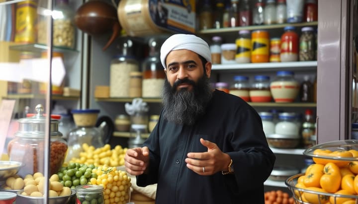 The shopkeeper, Mahmoud, had plenty of good things for sale, by God's will.