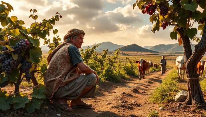 The next day, Hassan went with them to work on a farm, picking grapes, cultivating vines, raising cattle and sheep, and milking cows.