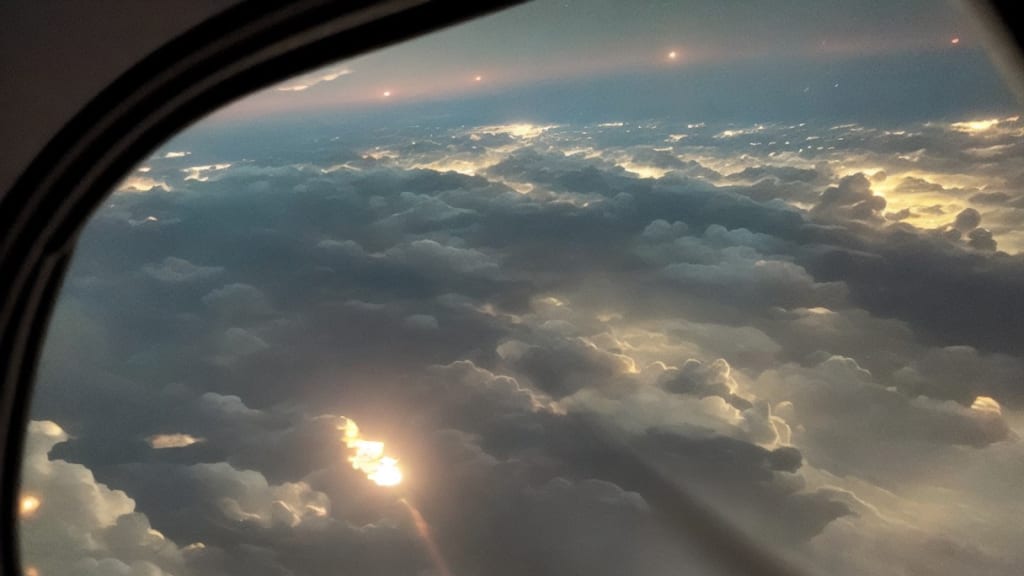 Boarding the plane, Andy couldn't help but notice that the atmosphere seemed unusually tense. The other passengers whispered nervously amongst themselves, casting furtive glances towards the darkening skies. Trying to dismiss the unsettling feeling, Andy settled into his window seat, allowing himself to imagine what strange occurrences might unfold on this seemingly ordinary flight. As the aircraft ascended into the twilight sky, he gazed out the window, lost in his thoughts.