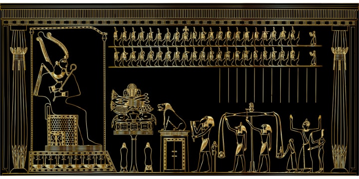 The kin stared as they descended past deep carvings depicting a building just like the ziggurat in ancient days… but it was wrong. Instead of lush jungles, the land in the images was a sun-scorched waste. A man holding a staff of power and bearing robes marked with what looked like symbols of rank or authority stood atop the building, defiantly staring into the sun, even as it sucked the life from his bones, bending his back, and aging him far beyond his years. Those who stood around him had youthful faces, but their bodies were twisted, the life being pulled from them by the sun that filled most of the carved sky.