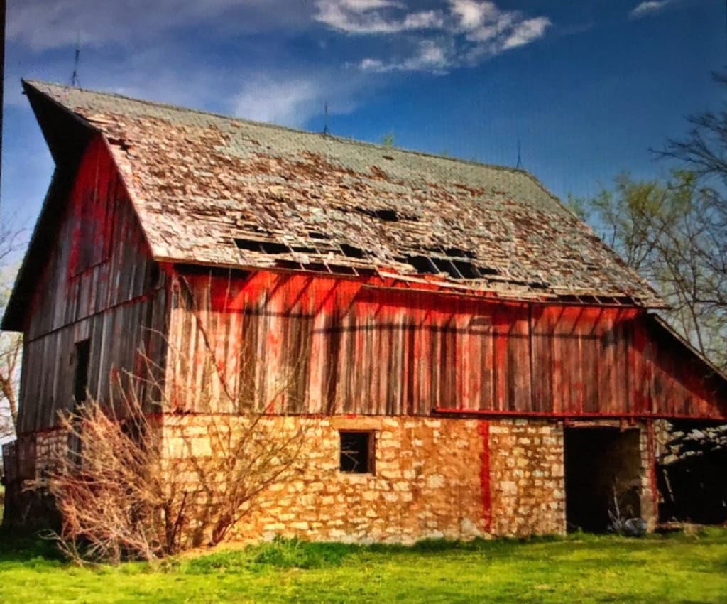 I wandered from the glorious old three-story farmhouse up the overgrown lane that leads to the old barn. There were no inhabitants now, no supplies of grain or hay. I remembered how I hated the smell of the alfalfa hay. There might be inhabitants I thought, but they hadn’t been invited. I passed a particularly out-of-control stand of gooseberry bushes and the barn came into view. Its weathered wood form stacked on the stone base had shifted several degrees to the right, and the grayed roof had slumped and fallen in, in some areas of the small structure. There would still be room to stable a horse, but the food storage would be compromised.